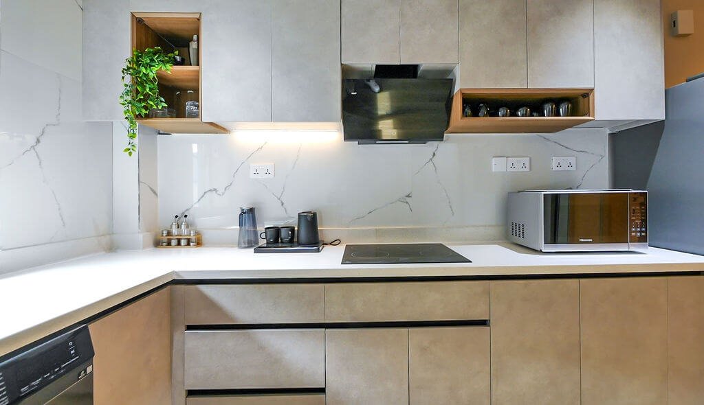 Features premium appliances including hob, chimney, fridge, microwave, as well as cutlery and crockery for a complete culinary experience.