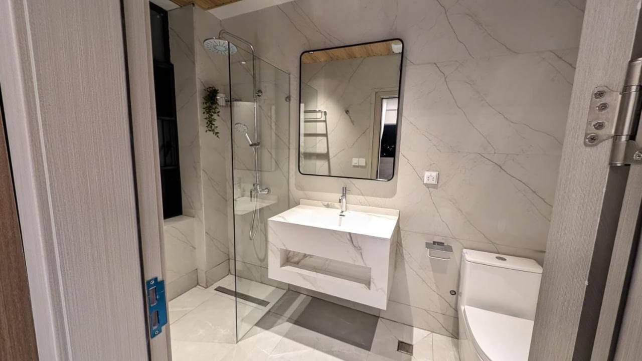 Sophisticated modern bathroom tiles and premium wood-like planks throughout.